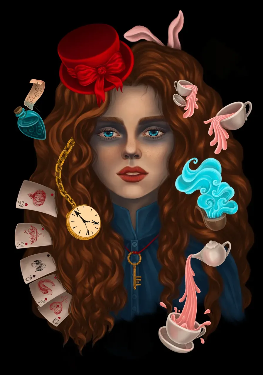alice wonderland fairytale illustration adventures mad illustrations party characters we are mad here colorful scene paintings drawings female surreal design graphic fantastic graphics chaos drink mug children poster story book artworks fantasy art fairy tale magic imagination girl cup background picture cartoon drawing