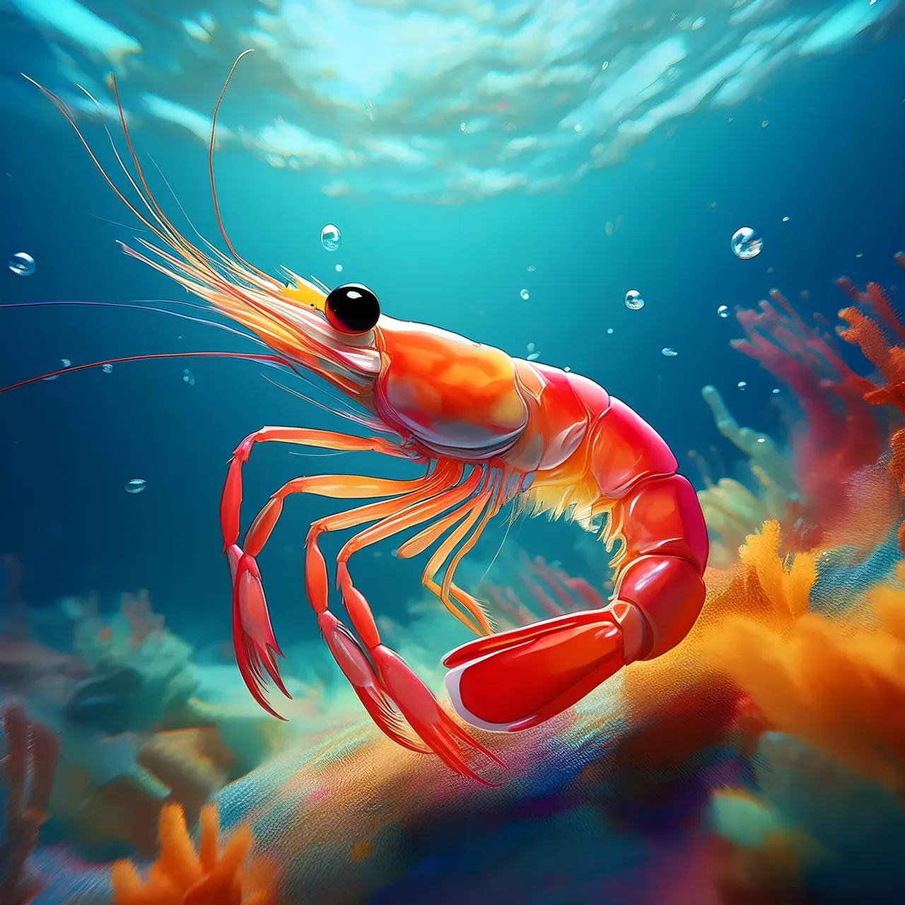 Colorful shrimp in the blue water. The beauty of nature