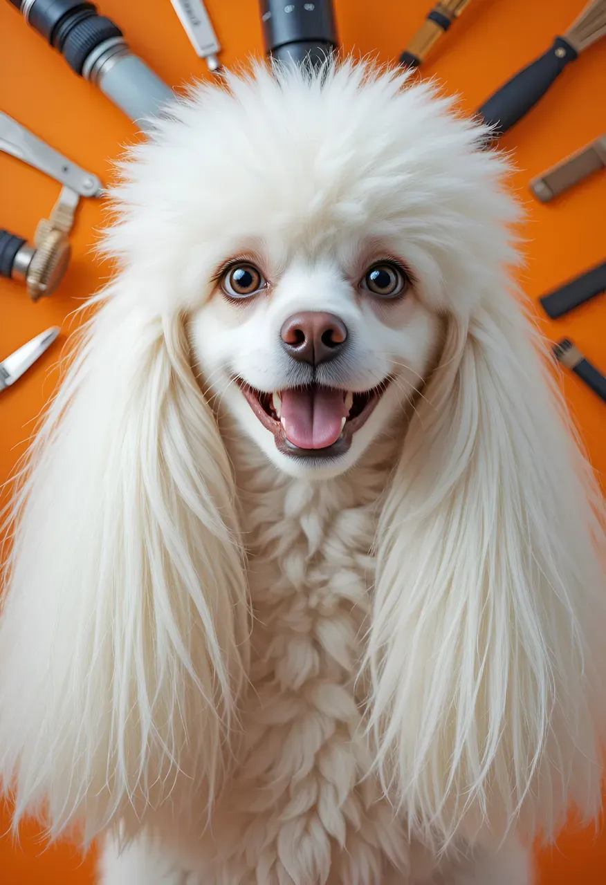 portrait of cute happy white Poodle dog around orange background with trimming tools. Ai generated