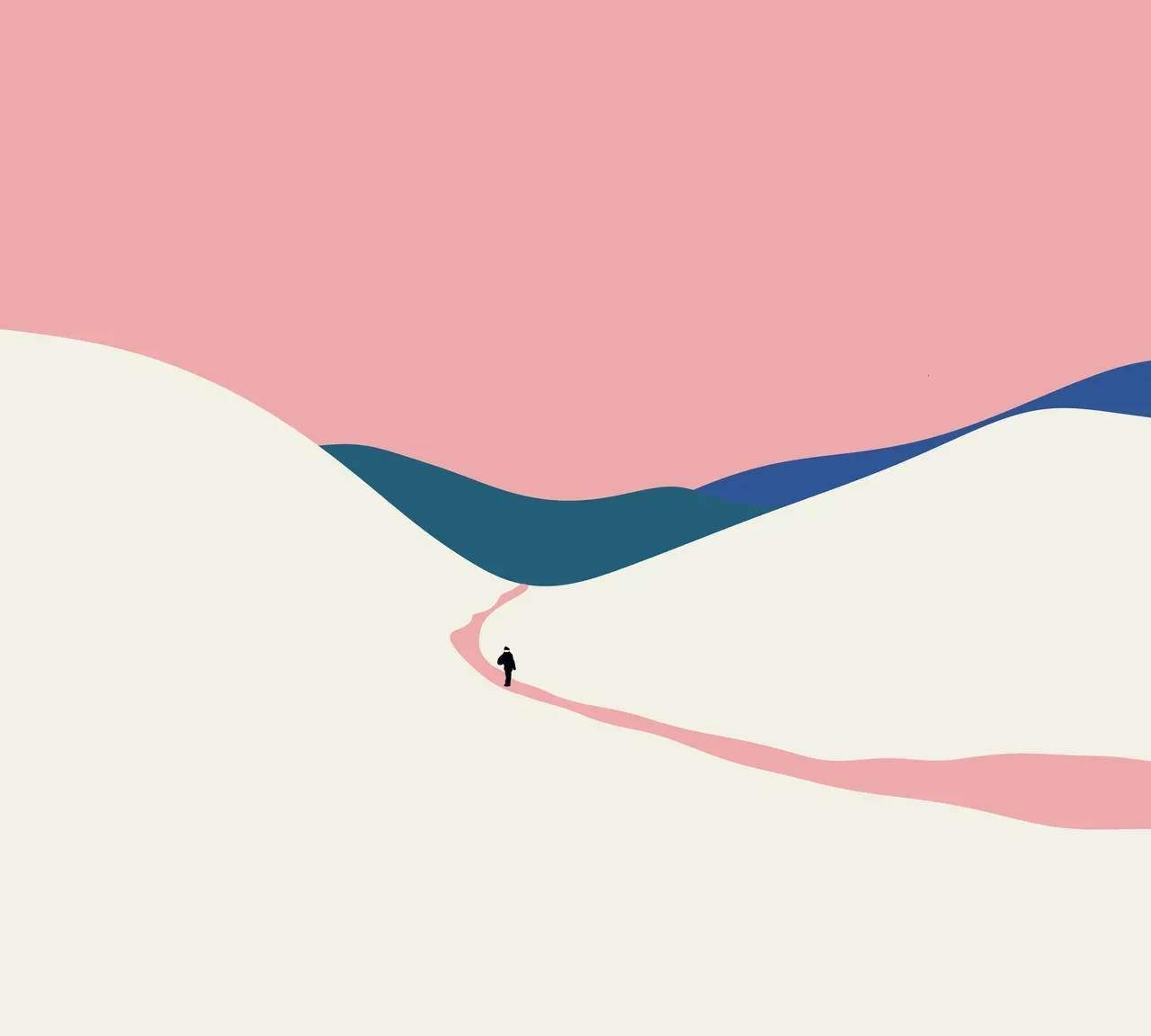 Man walking alone in the mountains with pink sky. Abstract contemporary aesthetic.