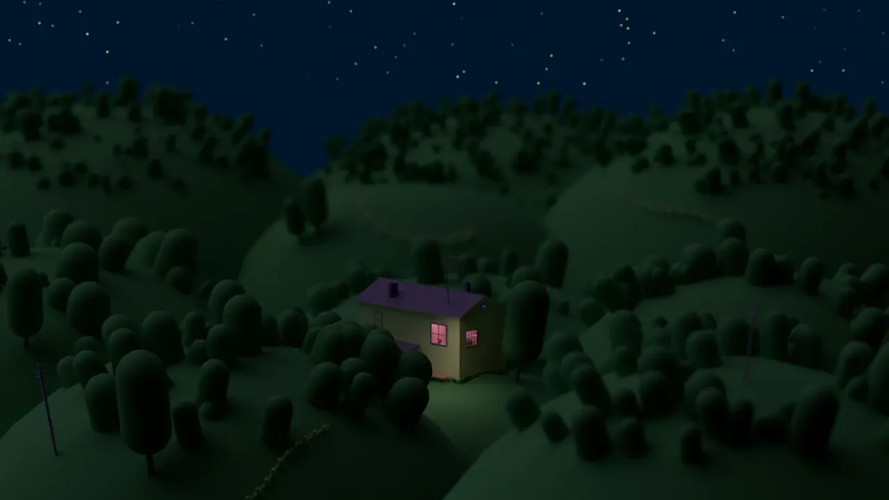 Night cartoon landscape with house. 3d render, 3d illustration.