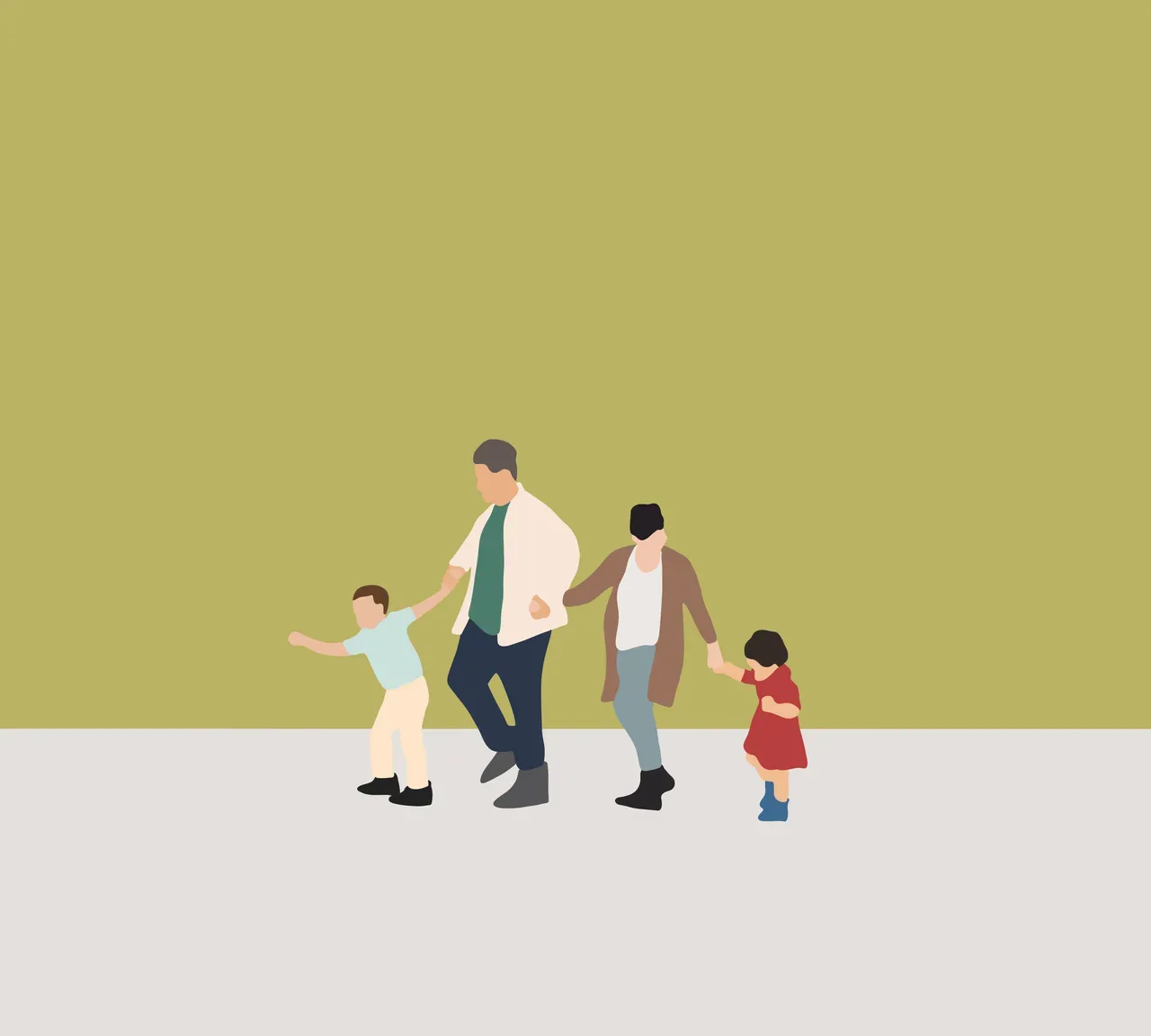 Family in casual lifestyle walking along suburban street spending sunny day holiday outside.