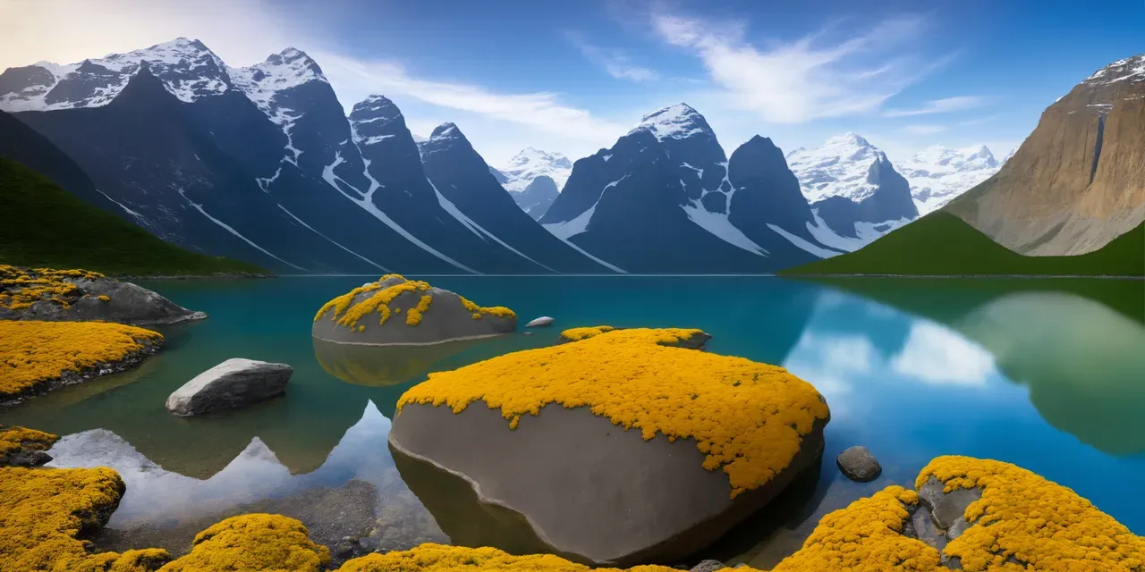a mountain range with a lake surrounded by yellow moss and rocks in the foreground