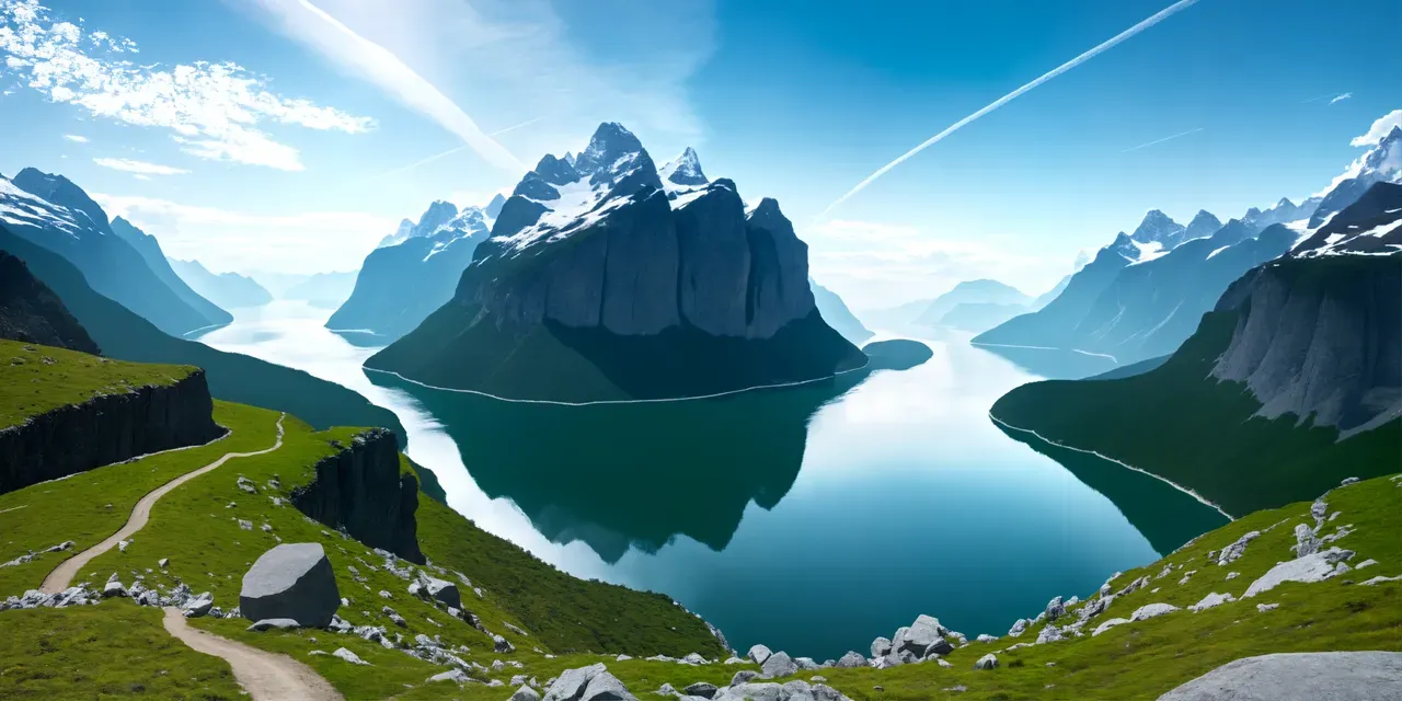 generative ai background peak no people light dramatic sunlight grass trail day panoramic tourist clouds islands peaceful island hill panorama blue mountains rock hiking beautiful scenery outdoor scenic water view sky tourism nature travel mountain landscape
