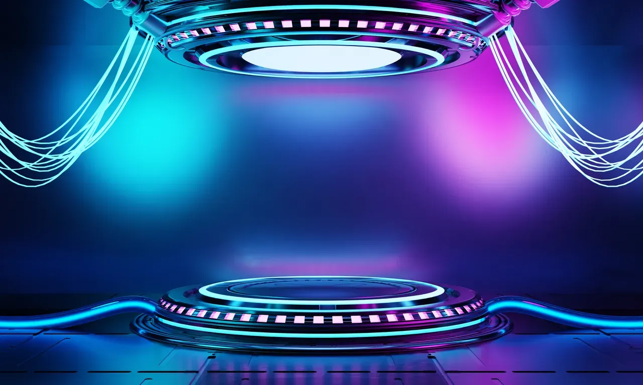 Inside spaceship laboratory with empty podium interior architecture with glowing blue and pink neon