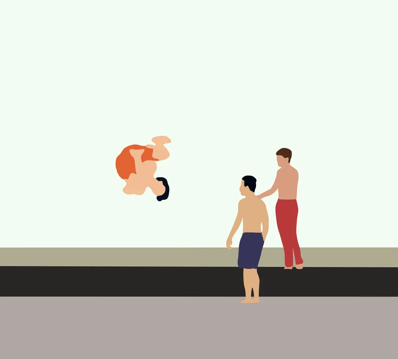 Man throwing somersault outdoors with friend. They are performing a stunt in the park.