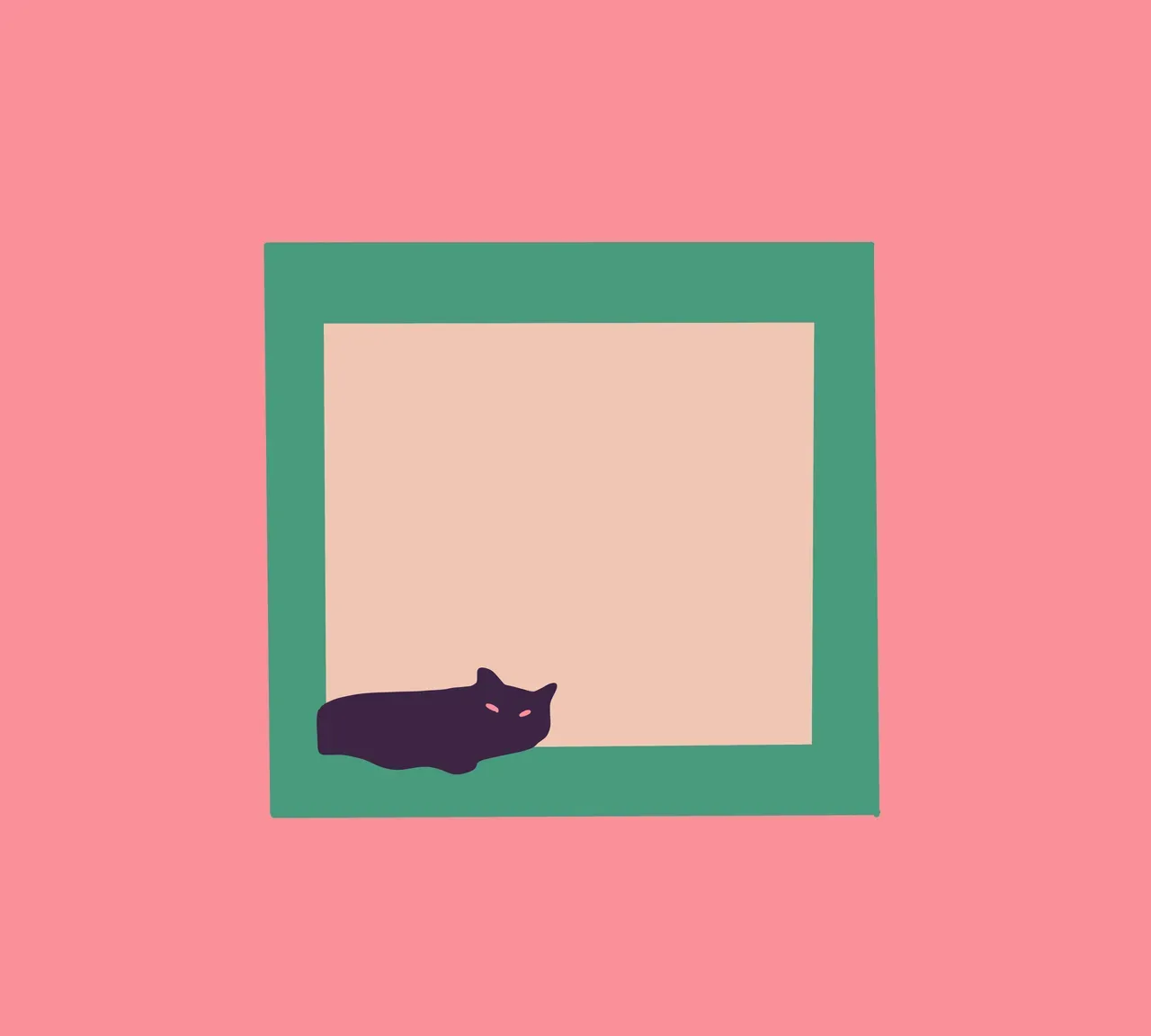 Cat sit and sleep on the windowsill. Minimalist color. Waiting for something. Vector flat