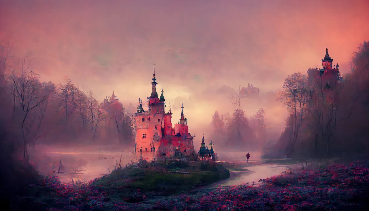 Castle Tower house medieval fairytale fantasy magical landscape fairy tale forest world mystery nature background night enchanted dreamy fabulous glowing flower pink magic mysterious dream imagination light tree sky mystical woods surreal woodland meadow idyllic fog misty skyline