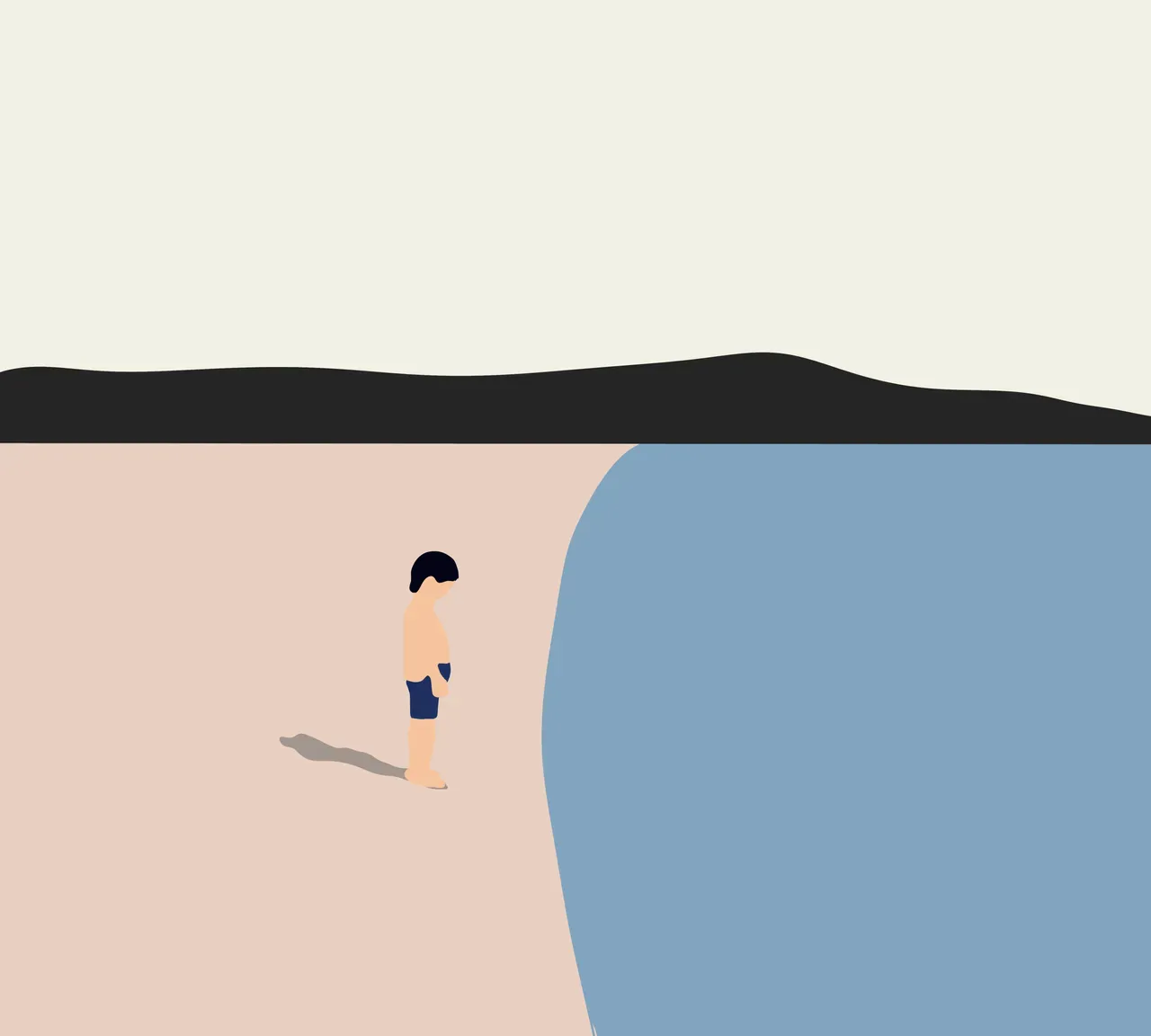 Boy standing on beautiful tropical beach. Child play at sea on summer family vacation travel.