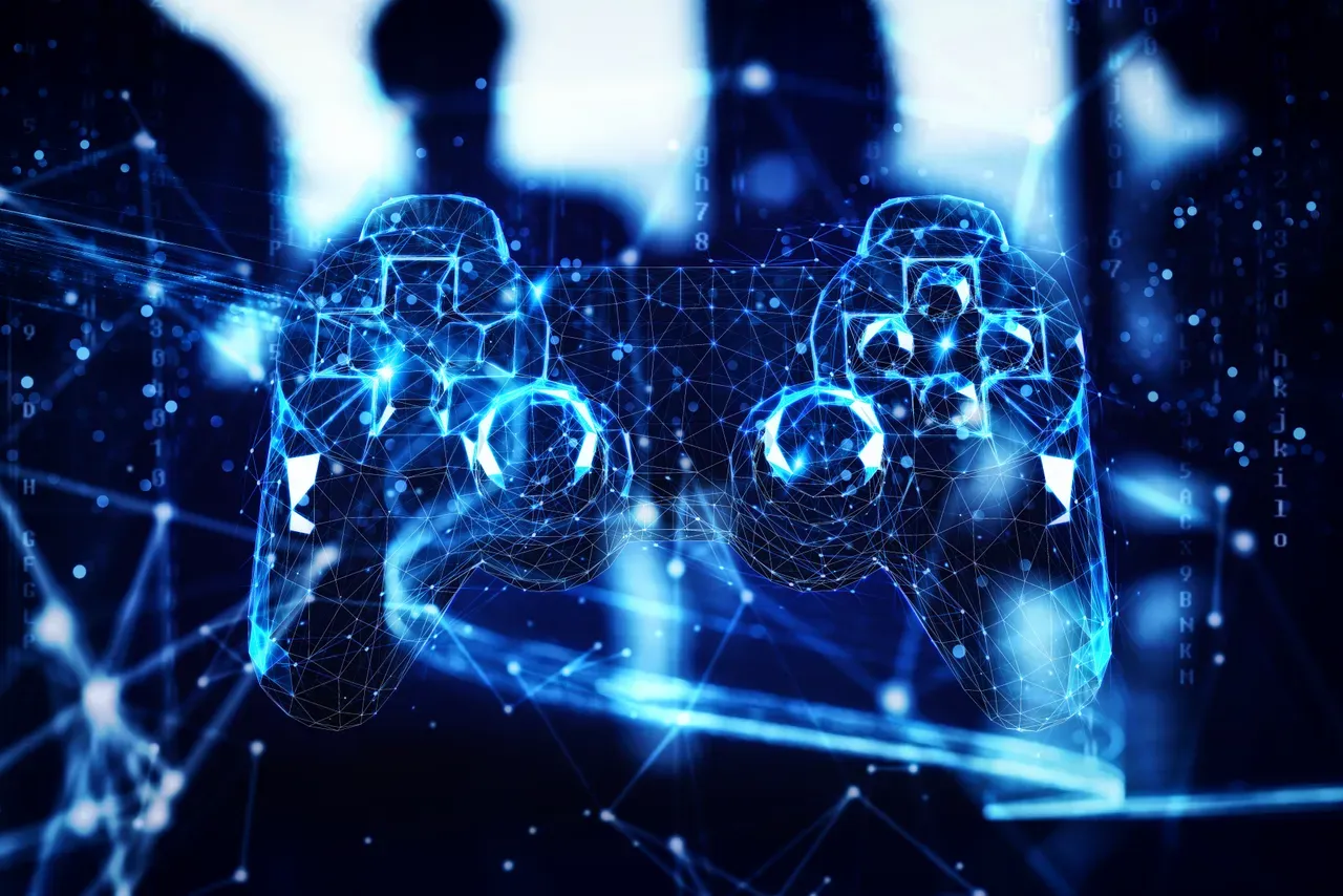Wireframe concept of a video game joypad on dark blue background. 3D Rendering