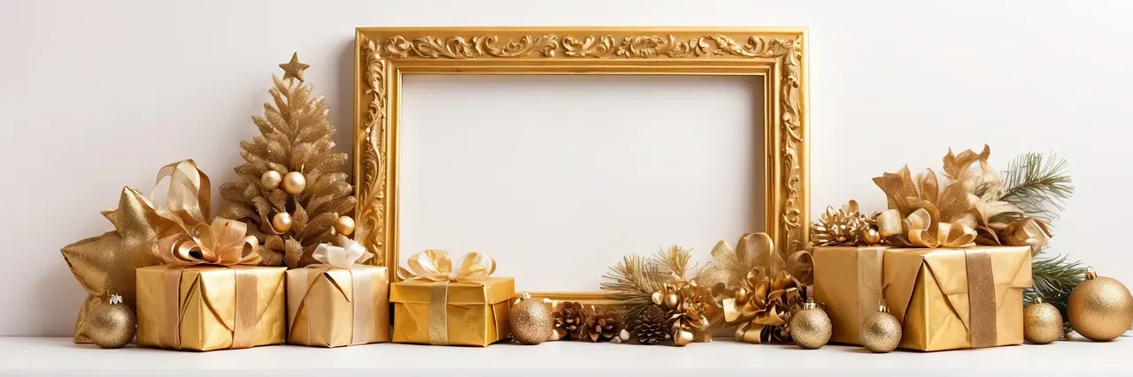 framing christmas gift boxes new year gift box bow white background festive mood christmas tree frame mock up tinsel confetti copyspace copy space congratulation space for text Gold packaging greeting magic eve holiday decoration present celebration winter ribbon ornament year new template season december card mockup congratulatory greetings background merry christmas ball Golden pine presents fir xmas banner AI generated