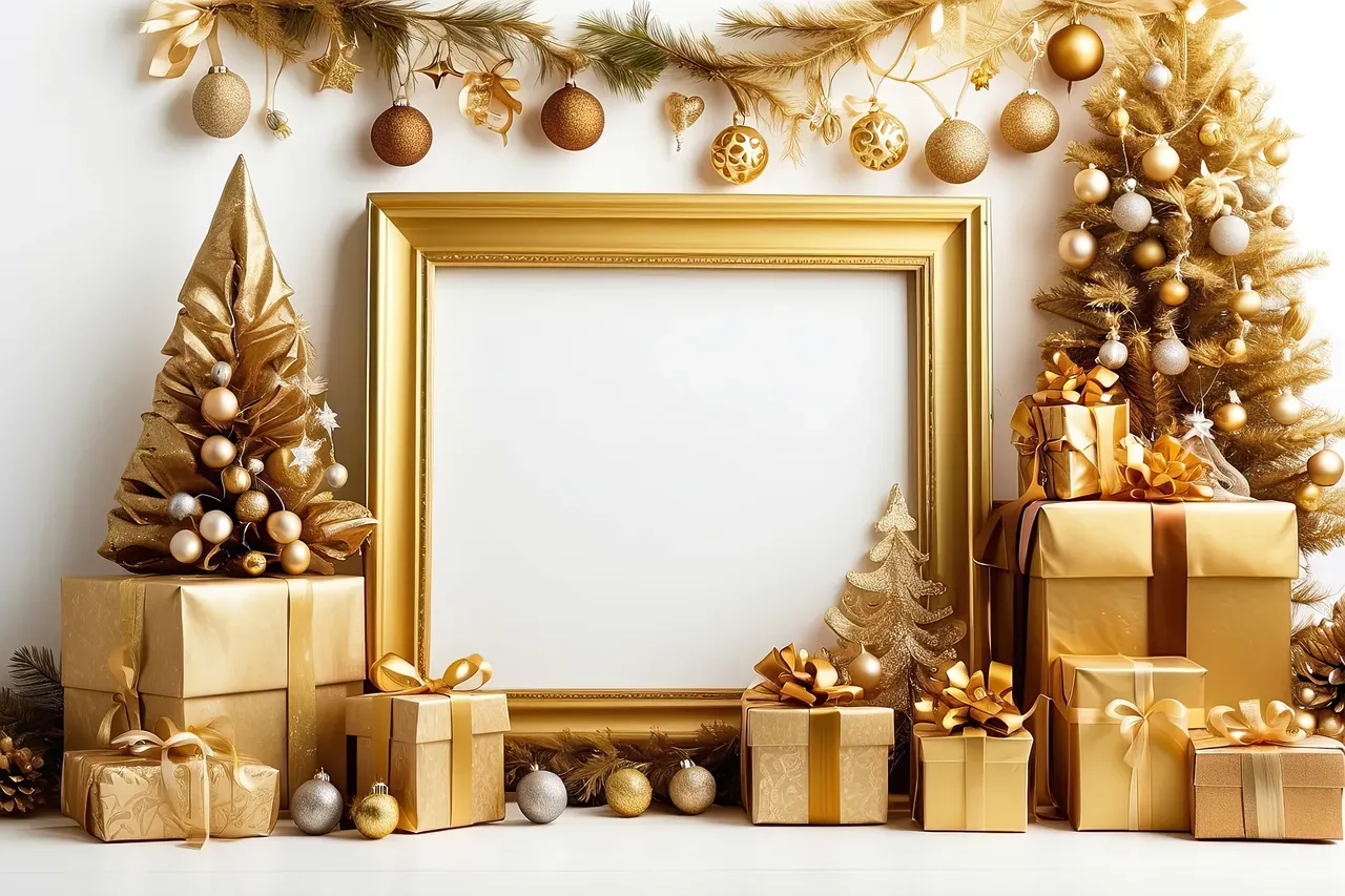framing christmas gift boxes new year gift box bow white background festive mood christmas tree frame mock up tinsel confetti copyspace copy space congratulation space for text Gold packaging greeting magic eve holiday decoration present celebration winter ribbon ornament year new template season december card mockup congratulatory greetings background merry christmas ball Golden pine presents fir xmas banner AI generated