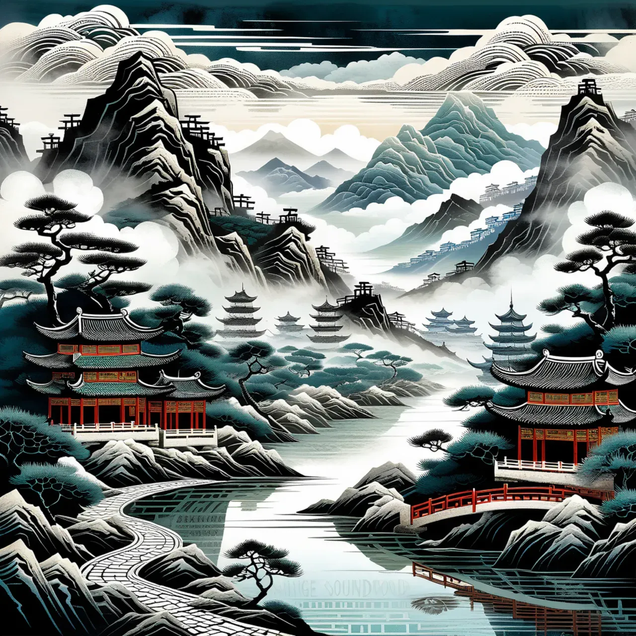Japanese Styled oriental garden Chinese painting Chinese landscape mountain water temple river rock pine tree moon iconic cultural park beautiful nostalgia traditional culture otherworldly