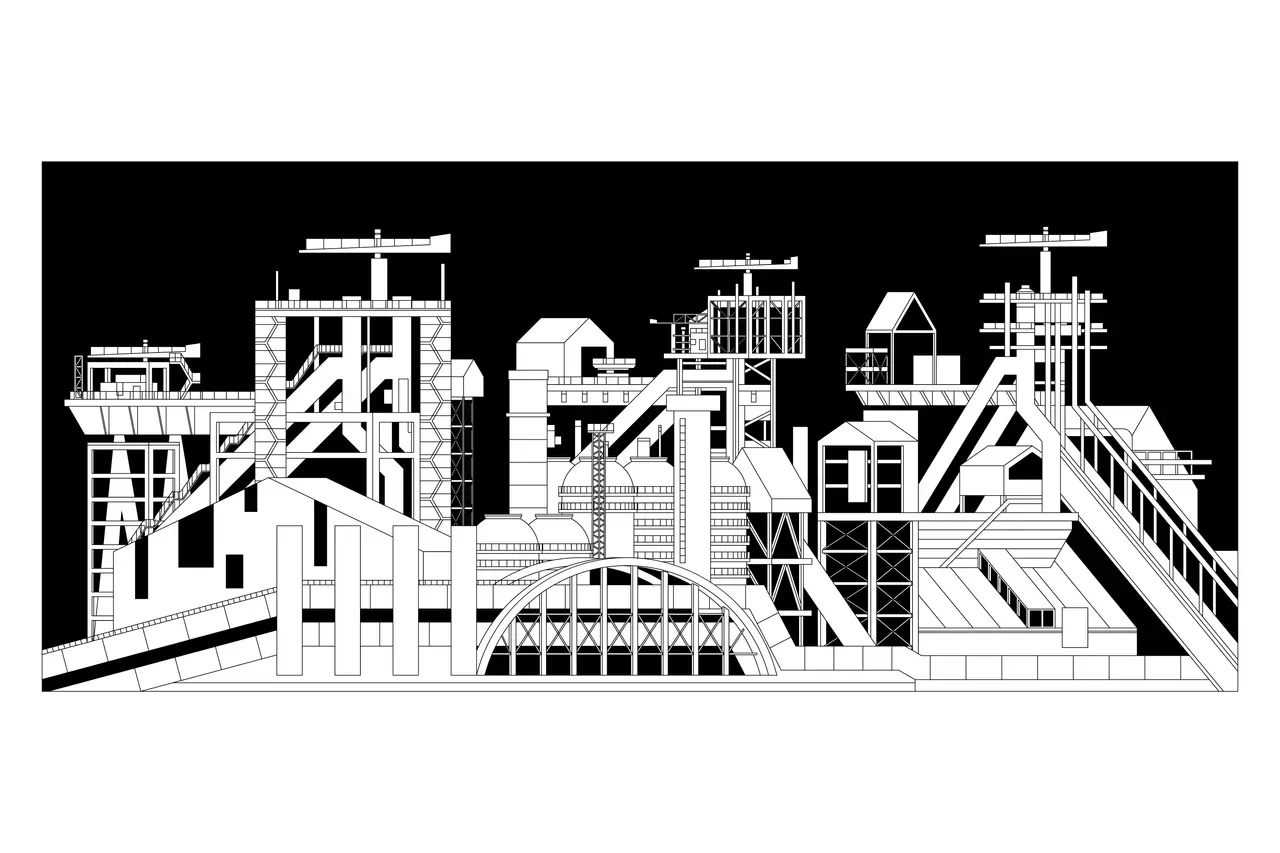 factory plant vector metallurgy mariupol azov manufacturing building industrial architecture building exterior coal chimney donets basin metal ore fuel and power generation ukraine sketch black and white slag heap