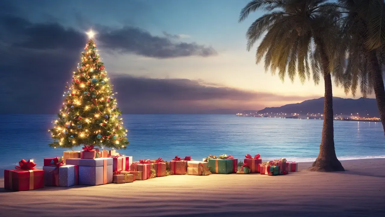 glowing Christmas tree with gift boxes on the ocean with palm trees.