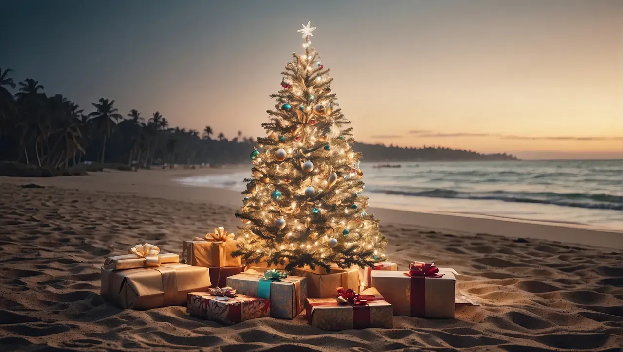 glowing Christmas tree with gift boxes on the ocean with palm trees. A tourist trip for Christmas