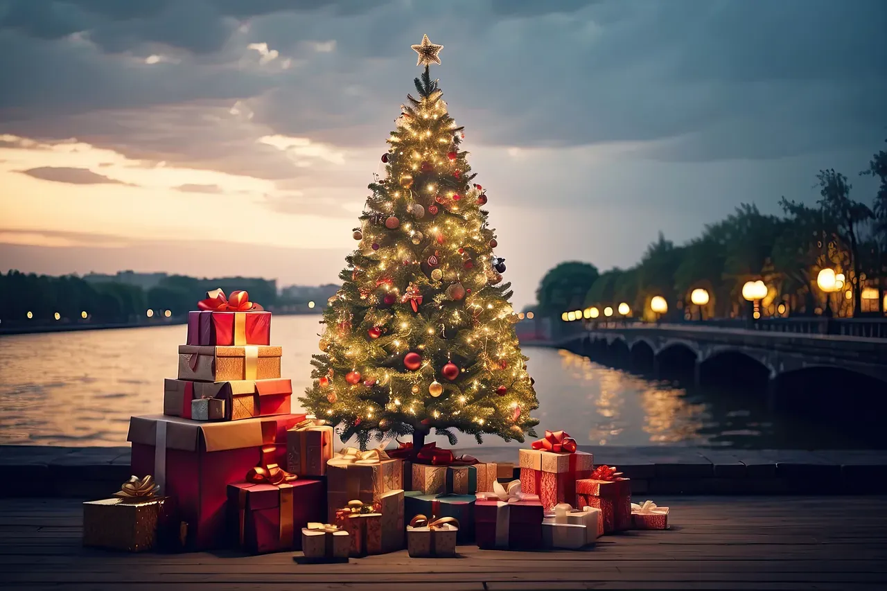 glowing Christmas tree with gift boxes on the wooden embankment. A tourist trip for Christmas