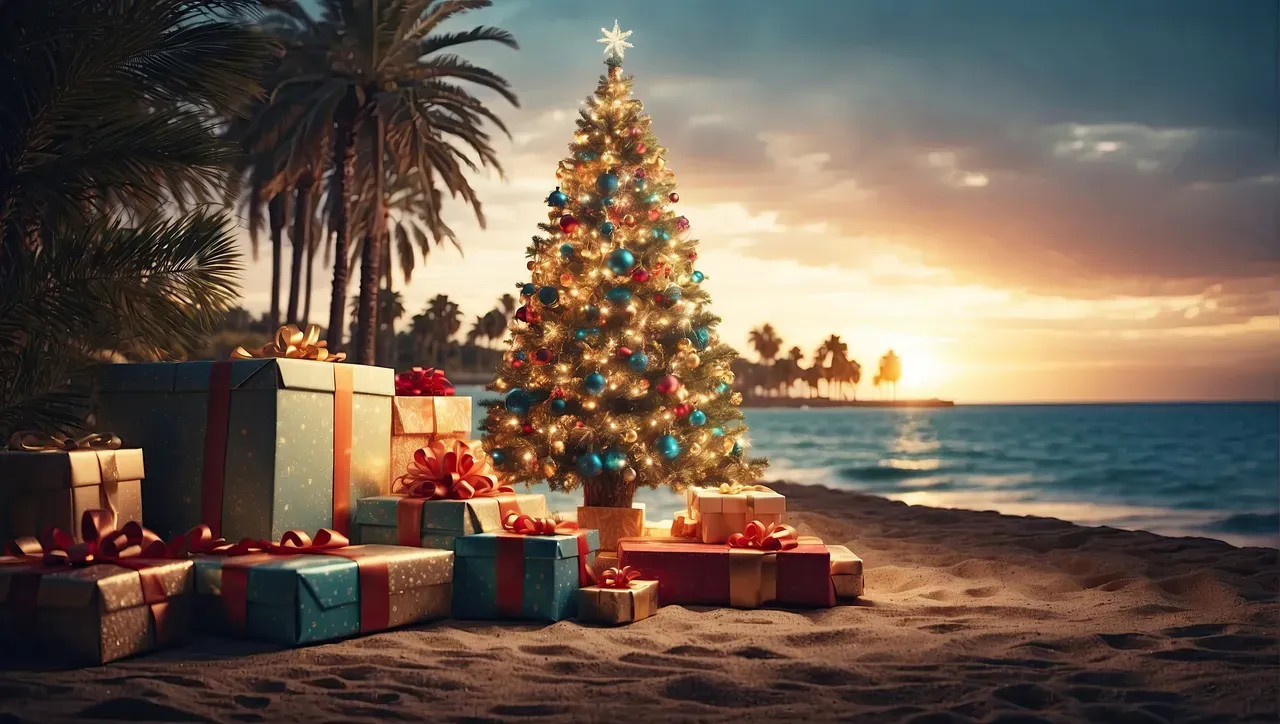 glowing Christmas tree with gift boxes on the ocean with palm trees. A tourist trip for Christmas