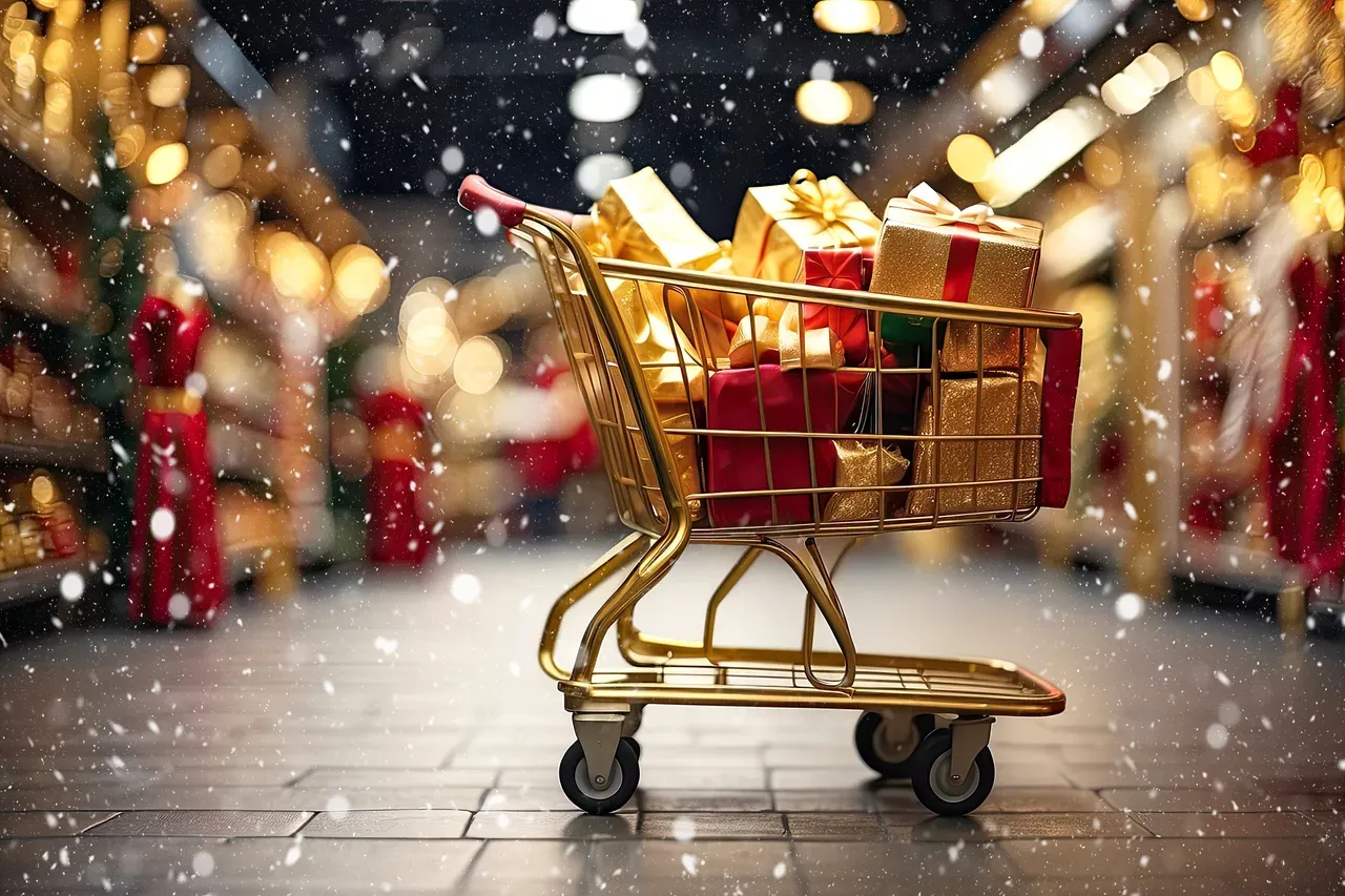 A supermarket cart with gold and red boxes of Christmas and New Year gifts between the supermarket