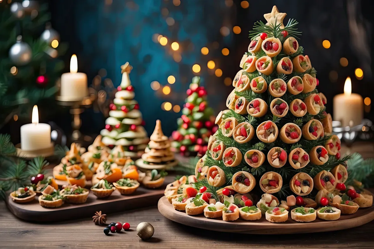 appetizer christmas tree snacks canapes rolls mini salad fish tartlets cucumber festive new year christmas table recipe salad presentation decor setting shape bokeh fairy lights celebrate served avocado menu filled pastry gastronomy traditional slice celebration cooking green homemade gourmet buffet tartlet canape plate starter sandwich healthy lunch restaurant party holiday vegetable dish AI generated