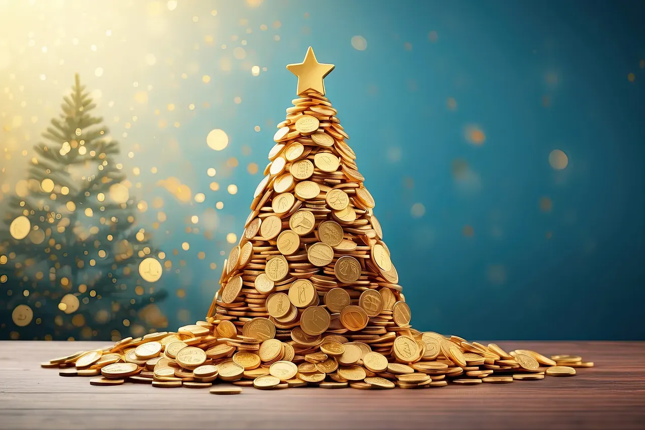 Christmas tree gold coins festive background fabulous new year Wealth Christmas wish fulfillment well-being dream finance economics economy bitcoin cryptocurrency currency savings deposit business investment insurance bank greeting commitment success concept sparkle illustration jewelry metallic banking rich jewellery luxury xmas coin cash dollar holiday golden money AI generated
