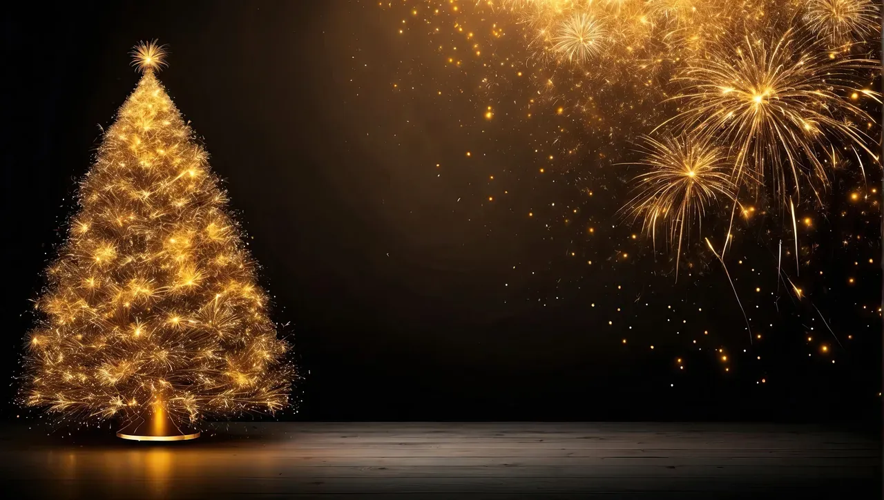 christmas tree golden sparklers fireworks new year background christmas banner space for text copy space copyspace gold illustration sparkler pyrotechnic traditional card flash december graphic xmas burn black shiny gift magic festival calendar wallpaper luxury illuminated ignition symbol happy decoration celebrate night glow party bright holiday eve design shine glowing shimmer light glitter AI generated