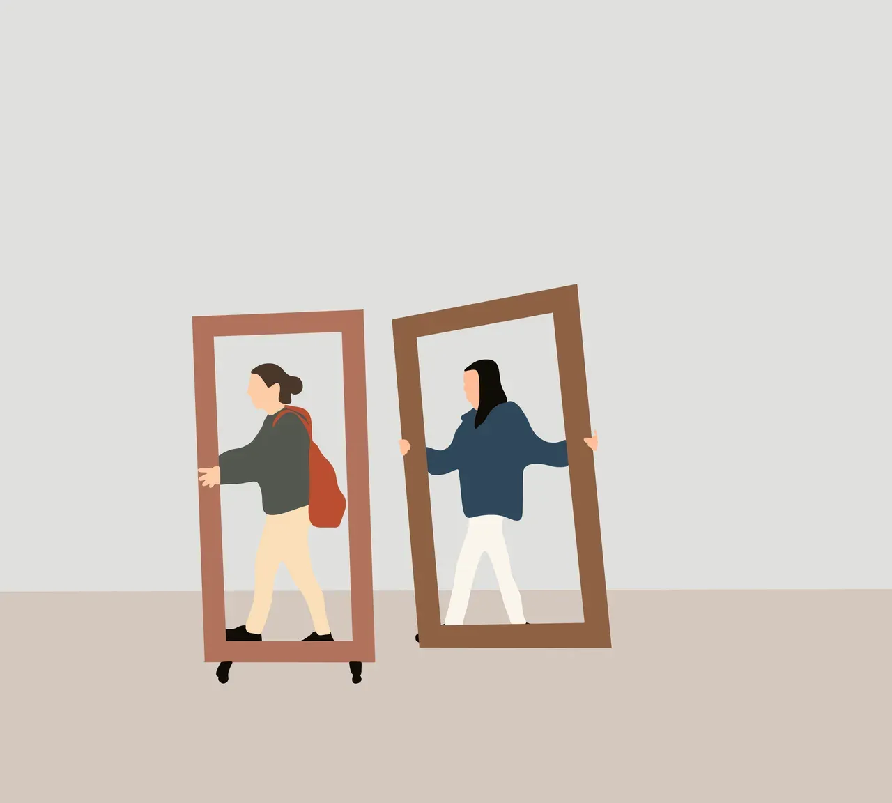Two woman carry wooden frame for renovate their house. Interior design home decoration concept.