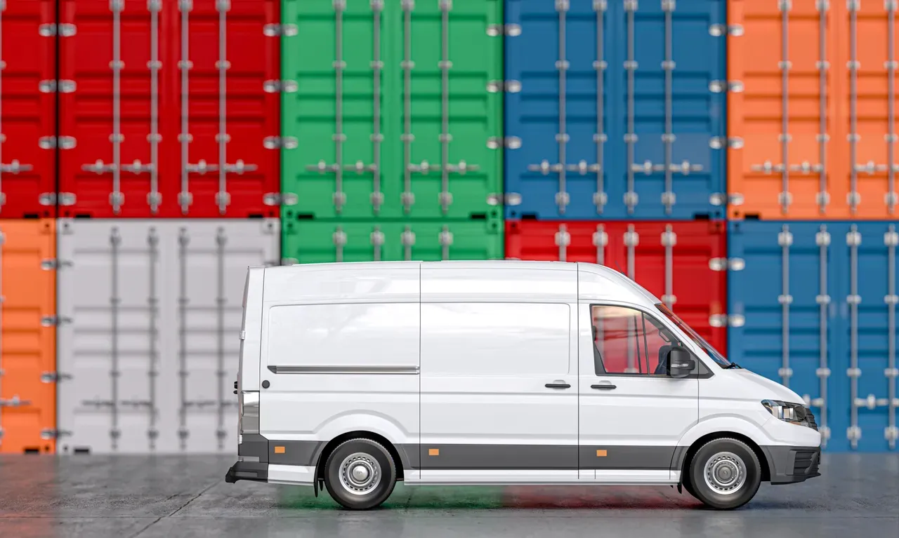 3d-rendered cargo van parked ready for loading in a logistics hub with colorful containers