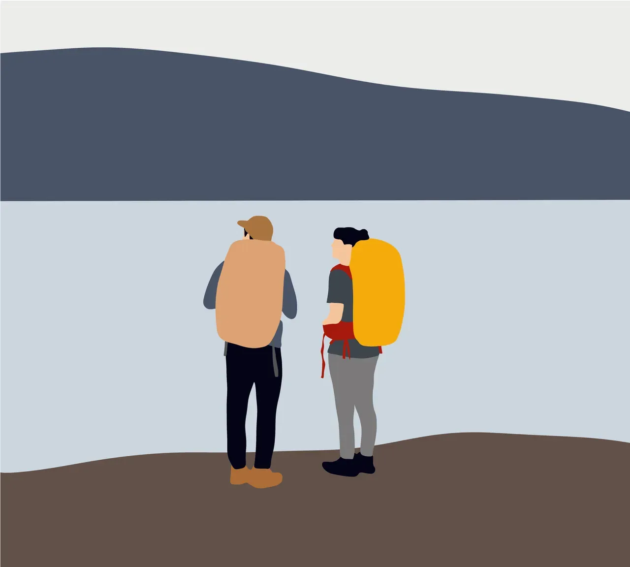 Couple hiking in the mountains with backpack and enjoying the view of valley. Mountain landscape.