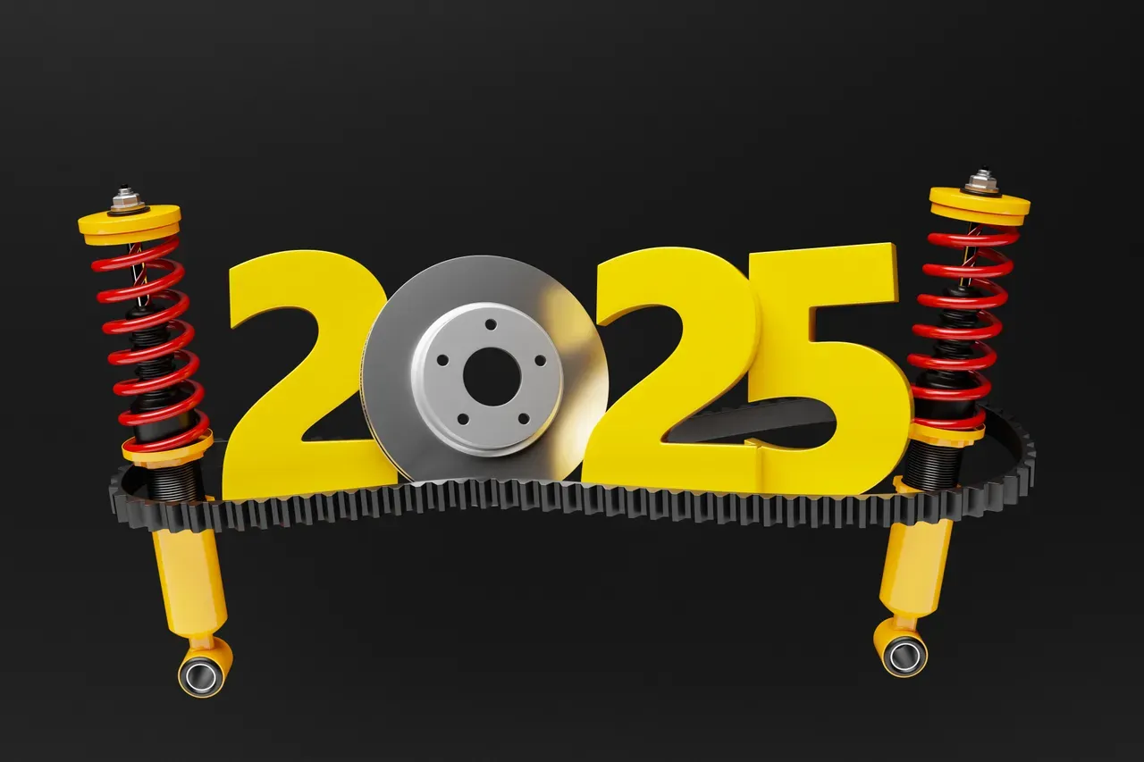 3d illustration of inscription 2025 and auto parts car on black isolated background.