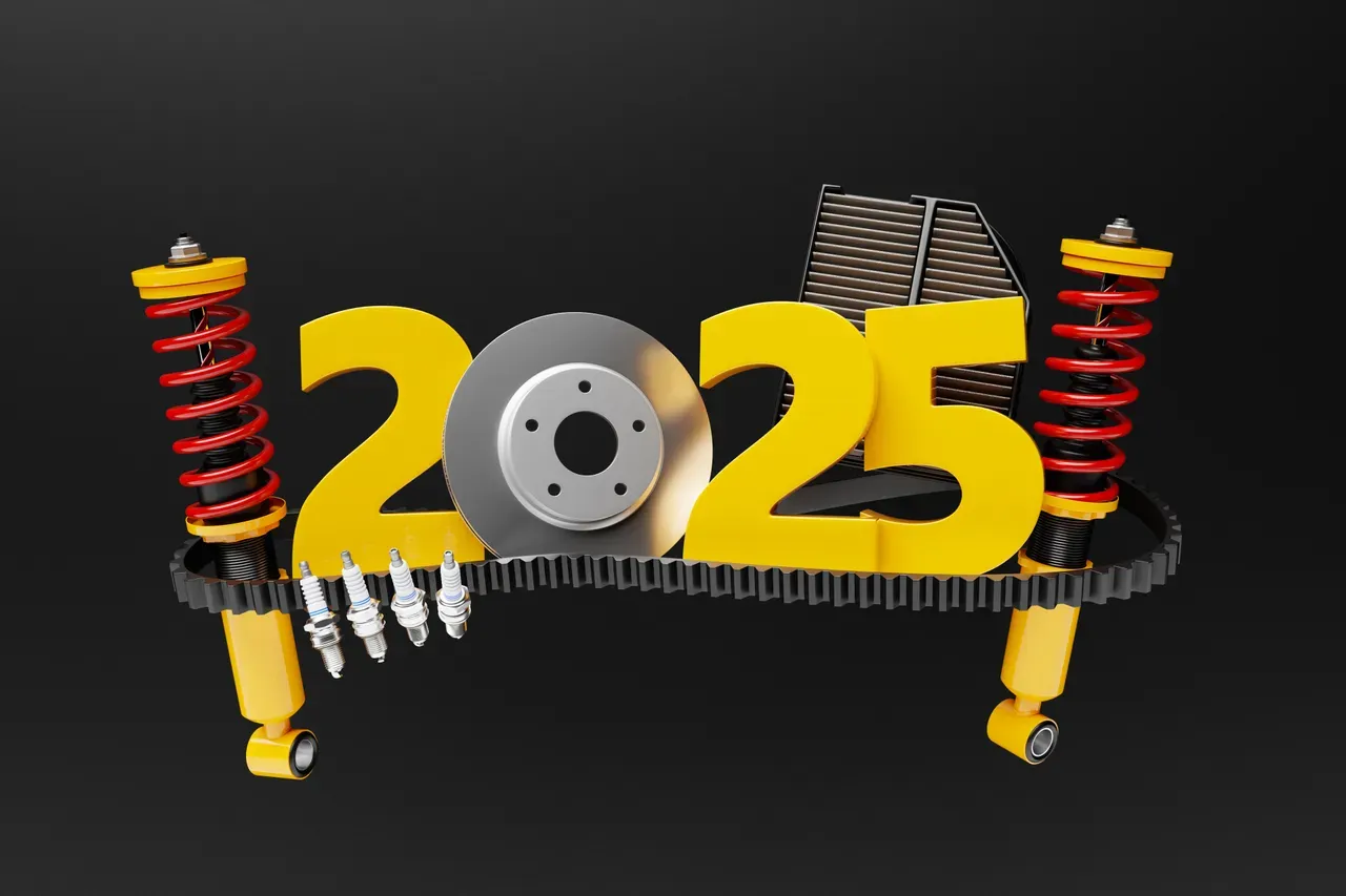3d illustration design happy new year 2025 with auto parts for auto mechanic service