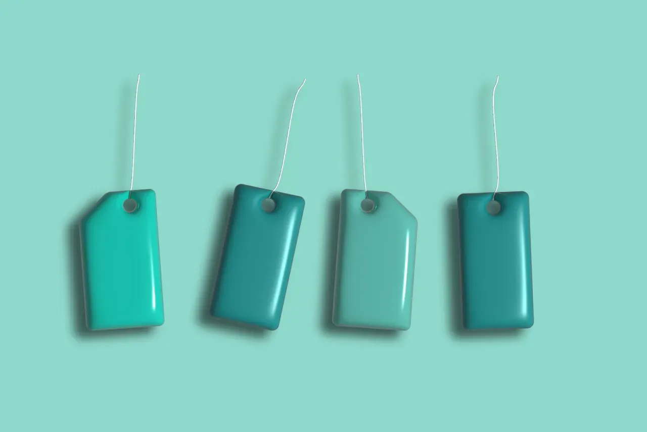 Empty green price tags on a rope, set. 3D illustration, rendering