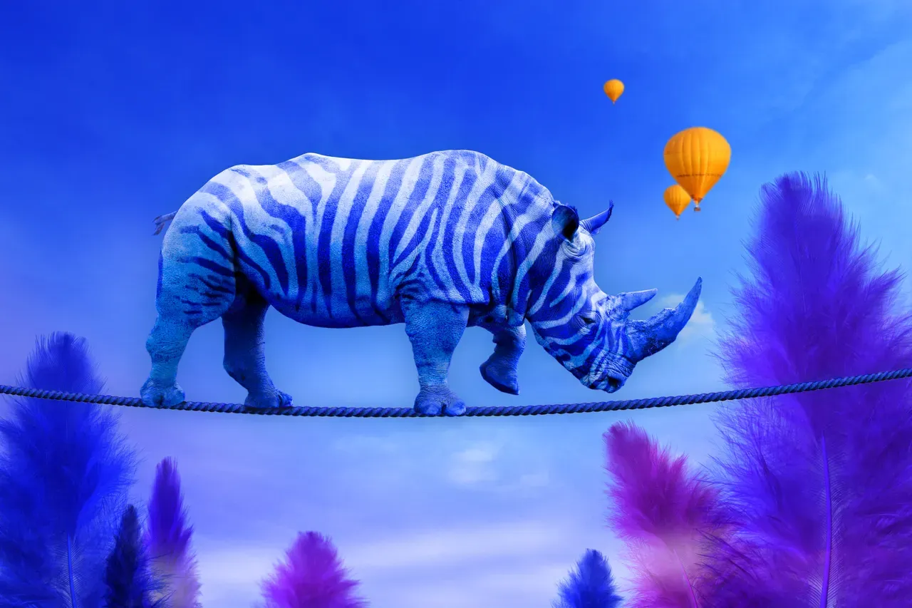 Imagination Success acrobat acrobatic africa animal art artwork balance balloon belief blue cable challenge circus confidence creative creativity danger daring disguised dream fantasy feather funny heavy innovation insurance light mascot massive metaphor power rhinoceros risk rope stable strength stress strong surrealism trust walk walking wild zebra rhino