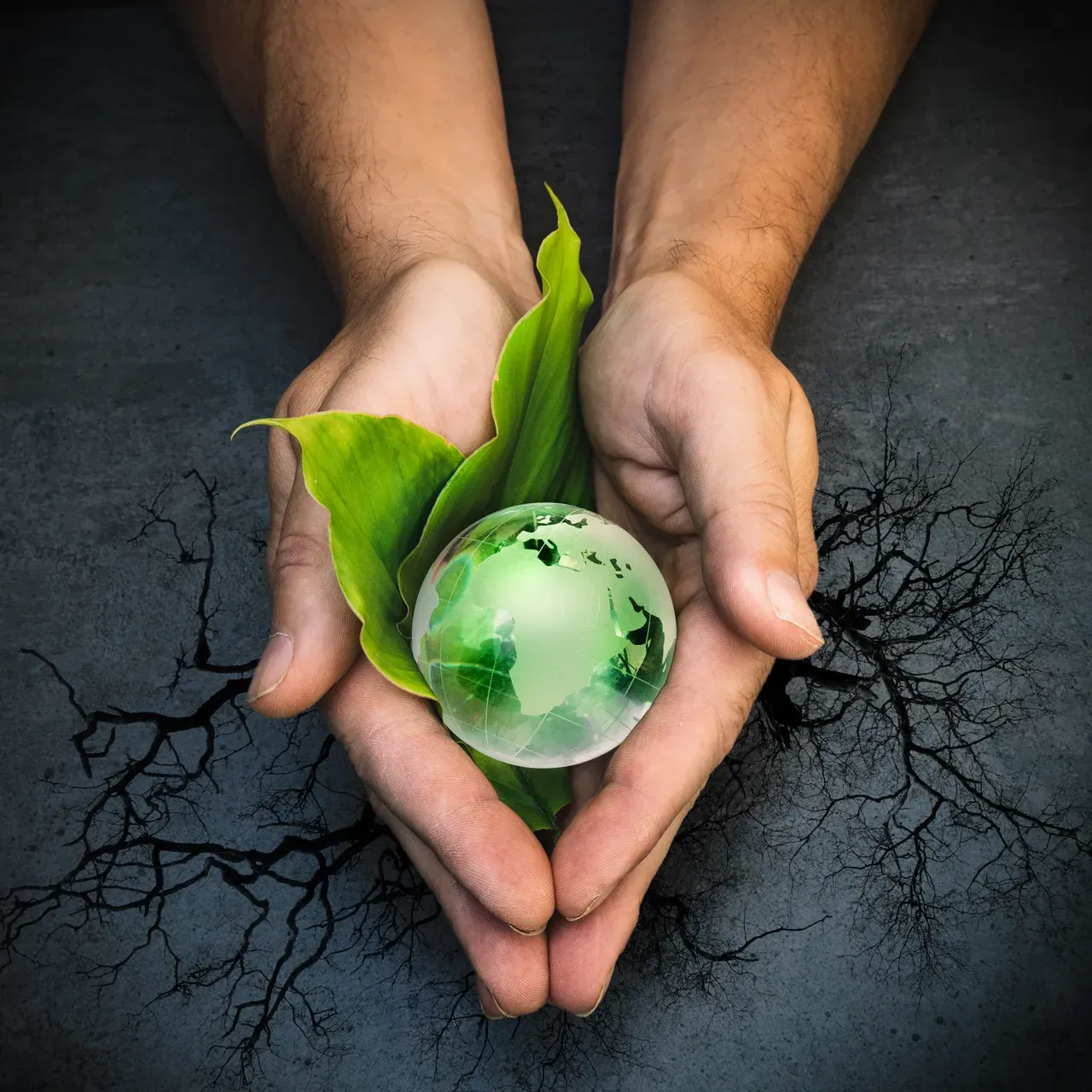 Hands holding a green globe of planet Earth on green leaves over tree and grey background