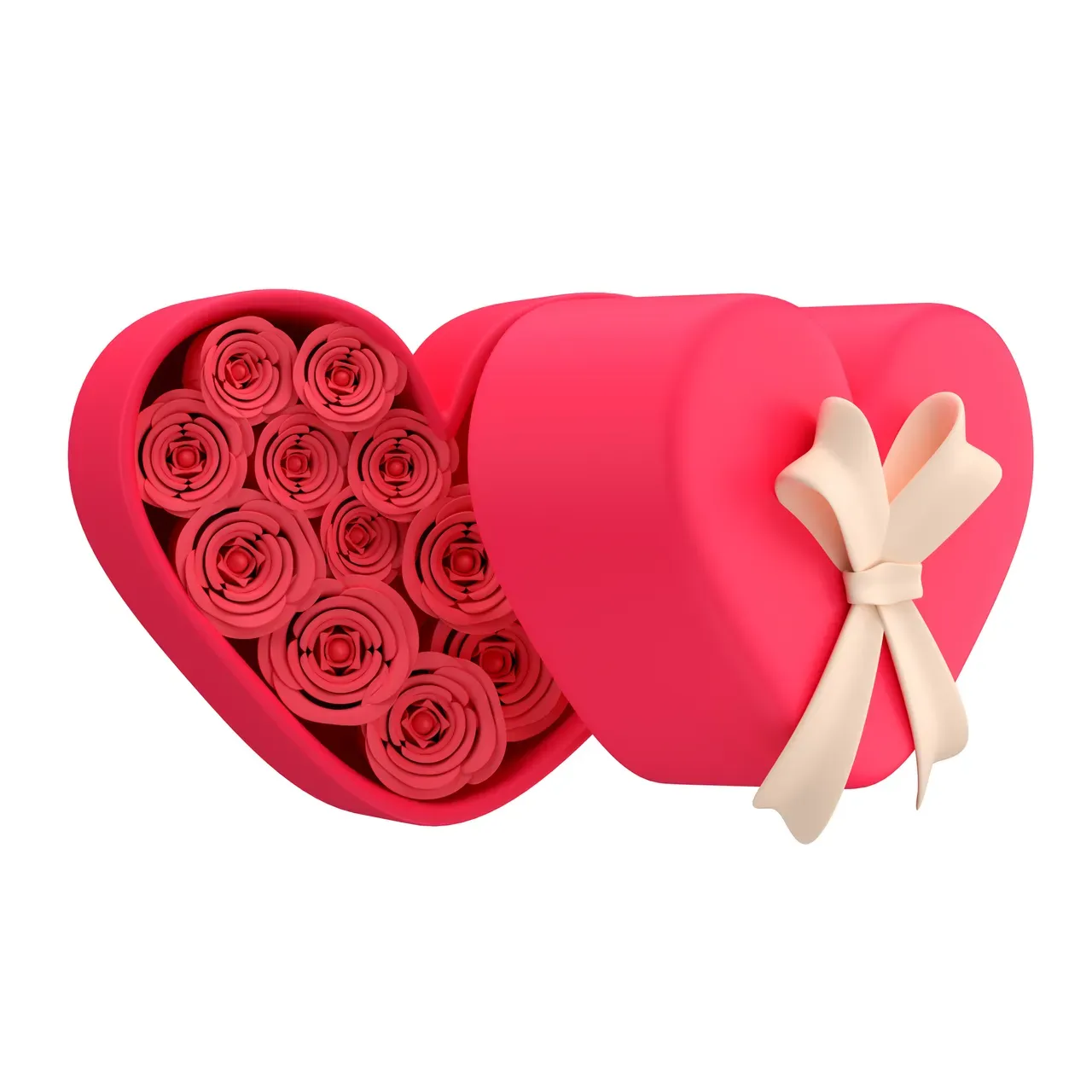 Heart-shaped box with ribbon and a lot of roses in it, 3d render