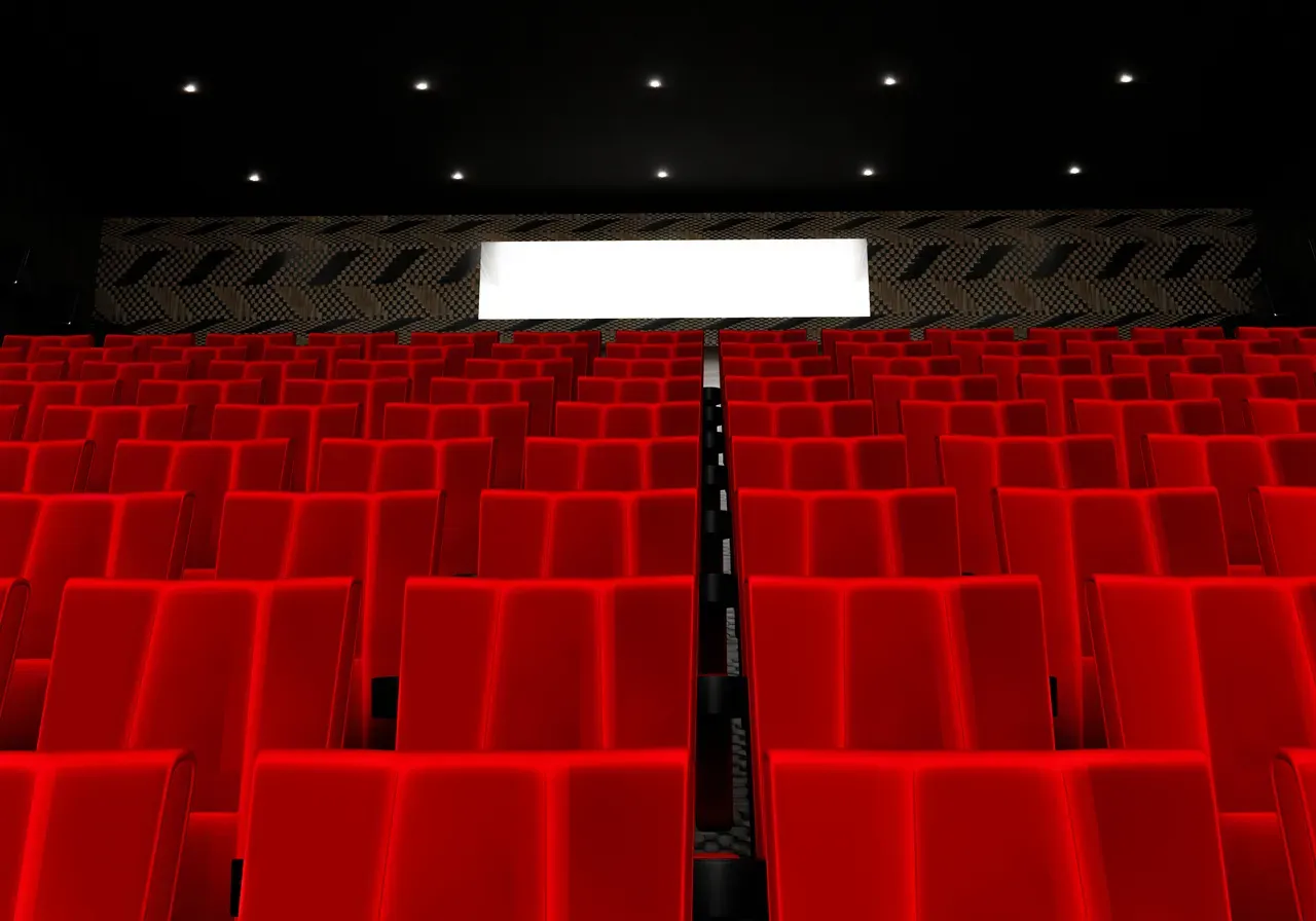 Rows of red velvet seats watching movies in the cinema with copy space banner background