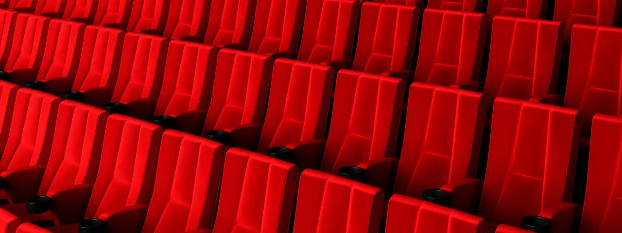 Rows of red velvet seats watching movies in the cinema with copy space banner background