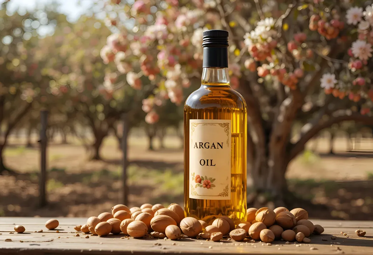 conceptual health argan oil stage argan life style herbal style image background aroma flower atmosphere base oil vitamine ingredient remedy blossom flacon garden green selective poster medicine healthy still life marketing food smell yellow natural bloom essence ai generated blossoming bottle product
