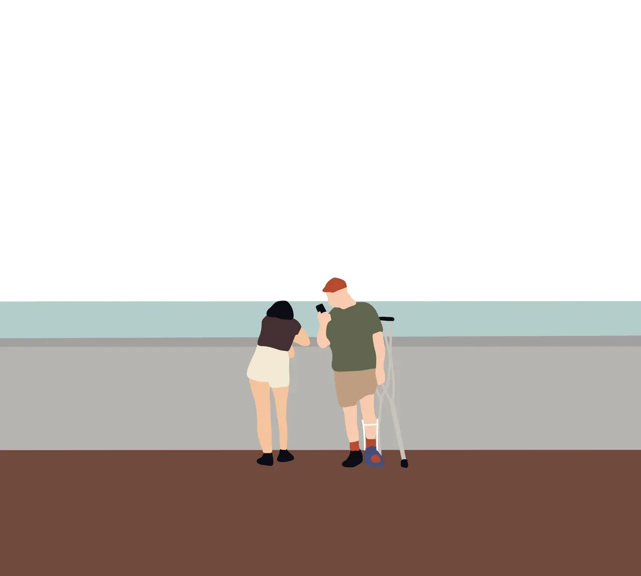 Man broke his leg standing with cast on his leg and crutches travel with his girlfriends
