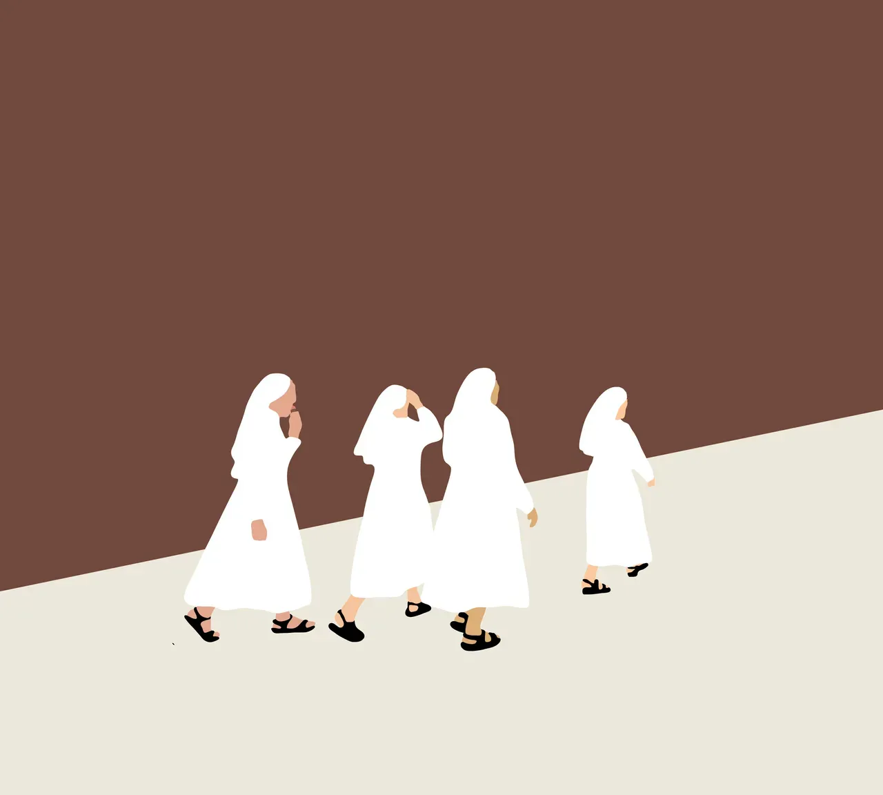 Nuns walk along the narrow streets of the city on a sunny day. Religious procession.