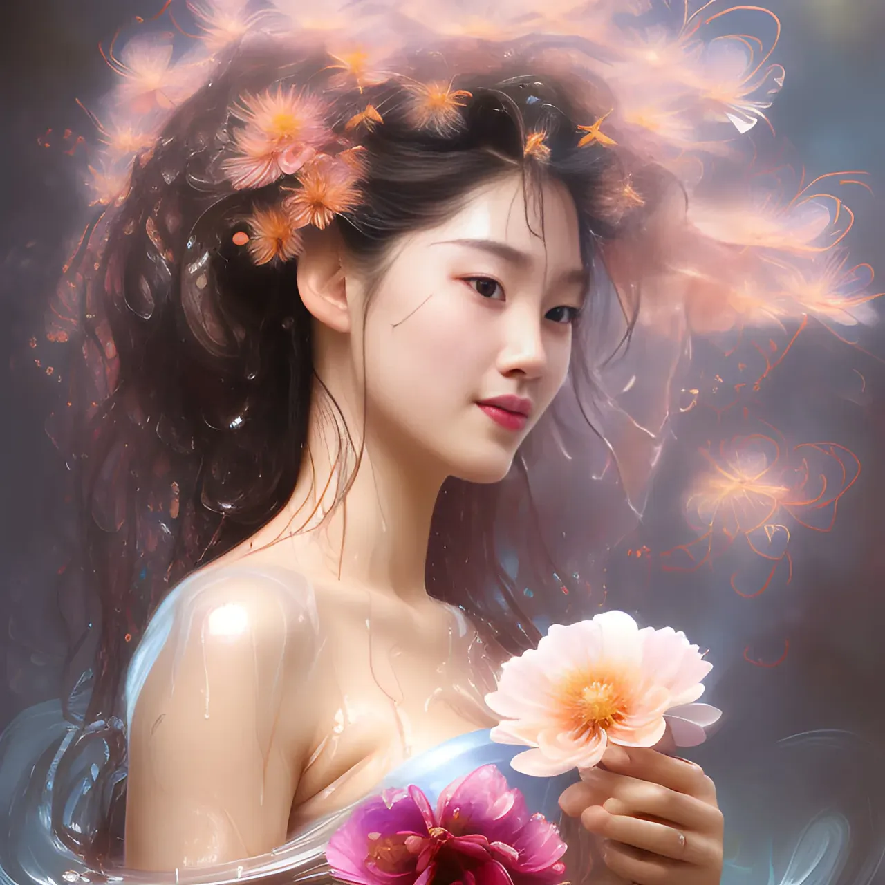 Generative AI, portrait of a beautiful woman wearing a yukata, holding a bouquet of flowing flowers, drenched body and flowers in her hair