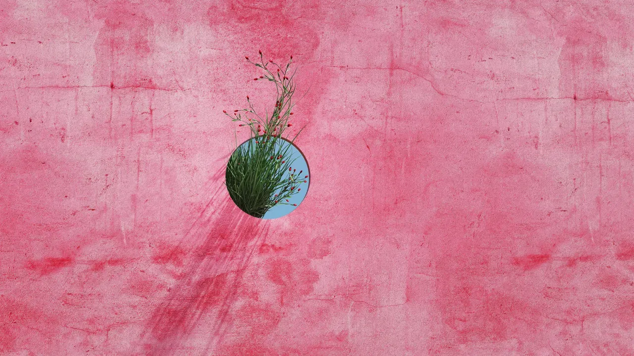 Color of year 2023 wall with round window and plant. 3d illustration, 3d render.