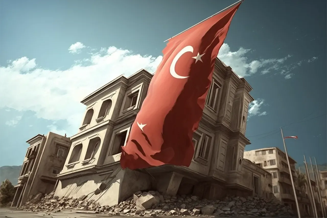 turkey illustration building earthquake disaster collapsed victim evacuation drill refugee camp flag artificial intelligence