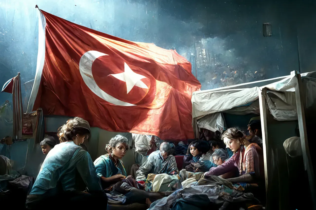 turkey illustration earthquake disaster collapsed victim evacuation drill refugee camp flag