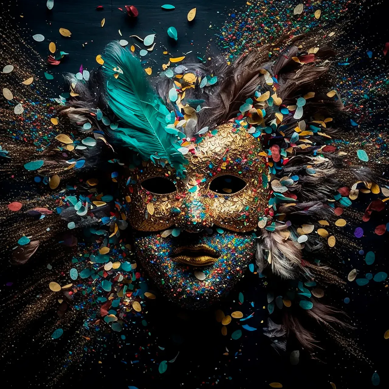 Mardi gras mask with lot of shiny confetti glitter and feathers. Neural network AI generated art