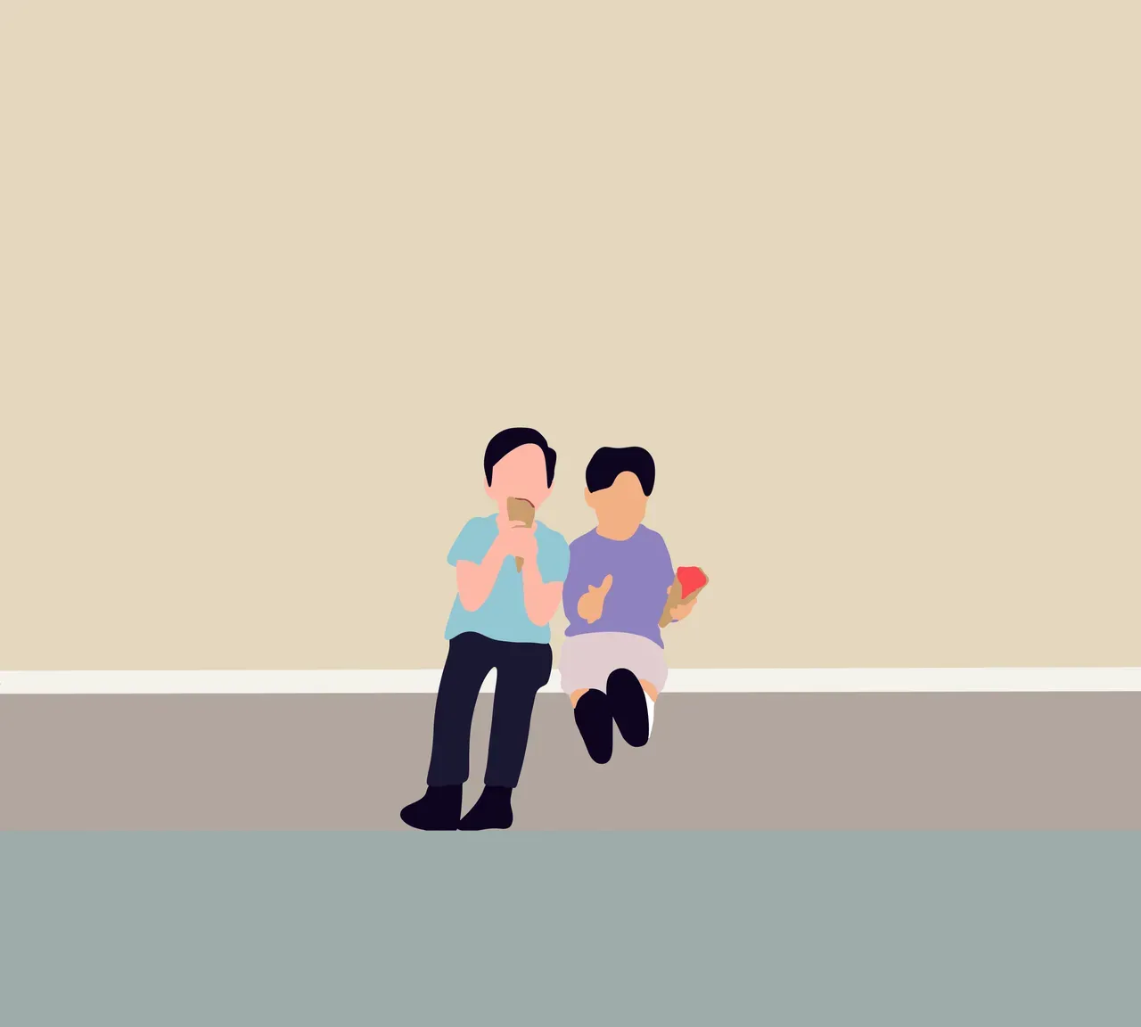 Two happy boys sitting on a bench eating ice cream together in parks and outdoors. Childhood concept