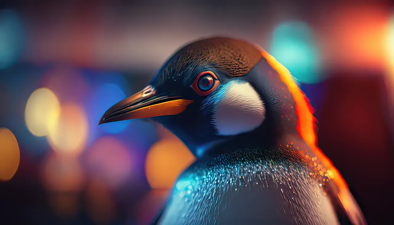 Penguin under colorful lights.