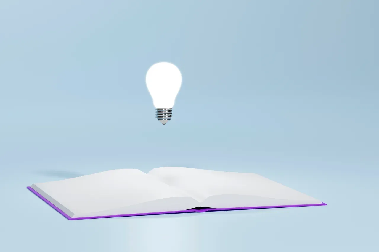White light bulb floating from open book on blue background. minimal design. 3d illustration