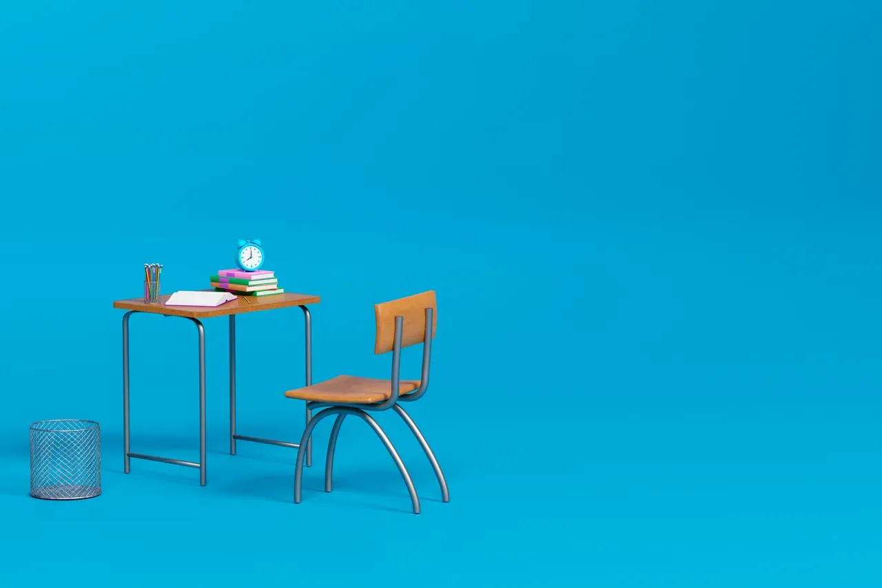 desk school education study design table background student book blue chair class back classroom child interior college concept creative 3d rendering copy space learning equipment knowledge pencil 3d illustration learn notebook beginning blackboard chalkboard drive educational first future inspiration large lesson open pen stack start stationery studying alarm clock crayons