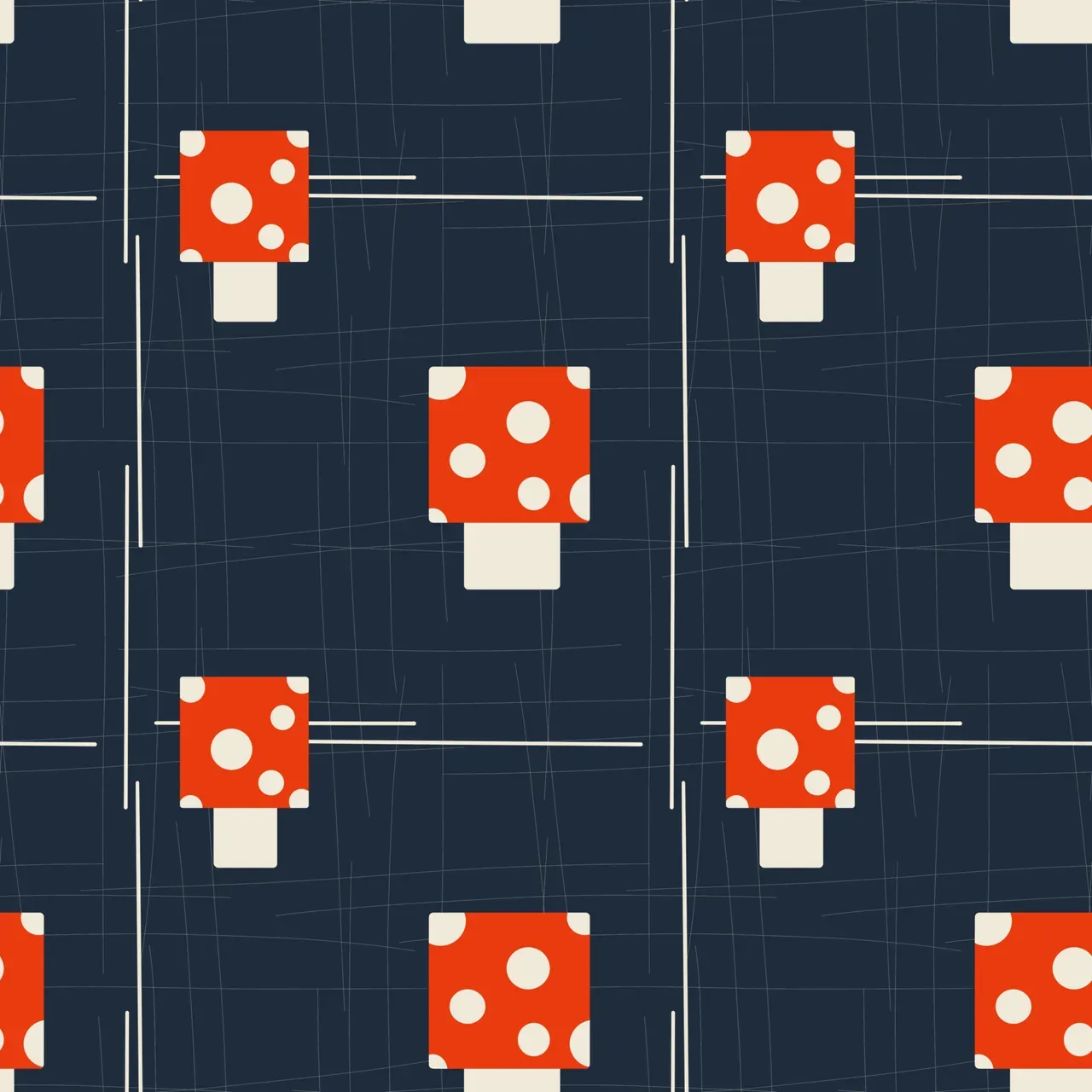 Seamless pattern with red mushrooms (fly agaric) on a dark blue background. Square pattern. Geometry